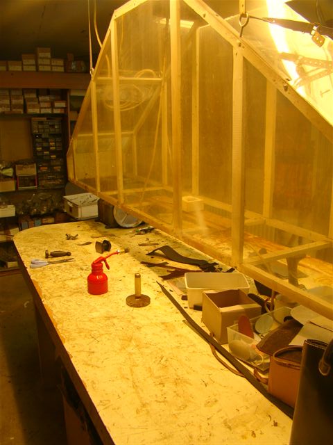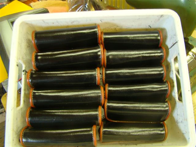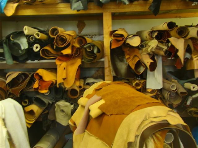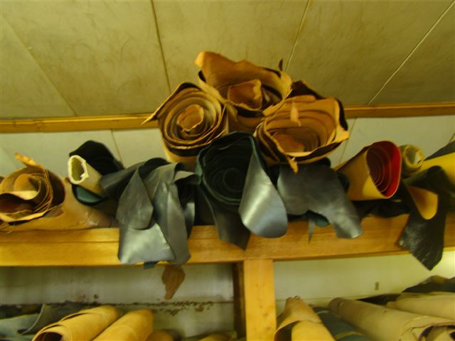 Voorraad leer in schappen en op bokken om uit te hangen om vouwplooien glad te krijgen. |