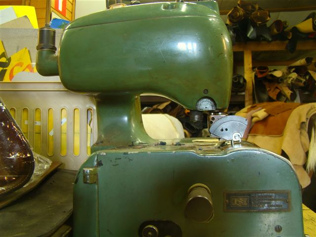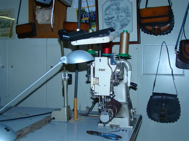 De stansmachine waar het leer m.b.v. stansmessen uit de vellen wordt geperst. 26 ton druk. |